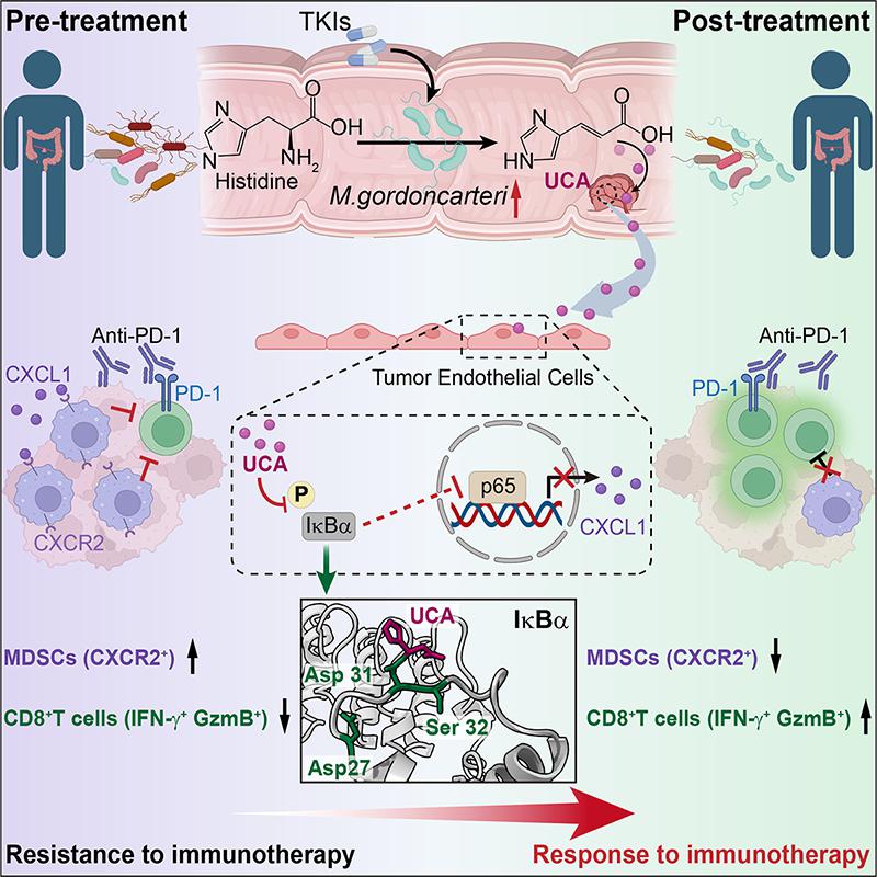 鉴于TKIs为口服药物,在体内必然会与肠道菌群发生相互作用。团队基于药物体内过程检测方法,发现肠道内TKIs通过增加Muribaculum gordoncarteri及其次生代谢物Urocanic acid(UCA)的水平,进而增强ICI疗效。具体而言,UCA可与IκBα发生共价结合,从而抑制NF-κB通路的活化。这一过程进一步导致肿瘤血管内皮细胞中CXCL1表达减少,最终抑制了由CXCL1-CXCR2轴介导的髓系来源抑制细胞(Myeloid-derived suppressor cell,MDSC)的招募。综上所述,该研究阐明了TKIs驱动肠道菌群代谢,助攻ICI疗效的新机制,也揭示了UCA和M. gordoncarteri可作为ICI响应性的生物标志物。